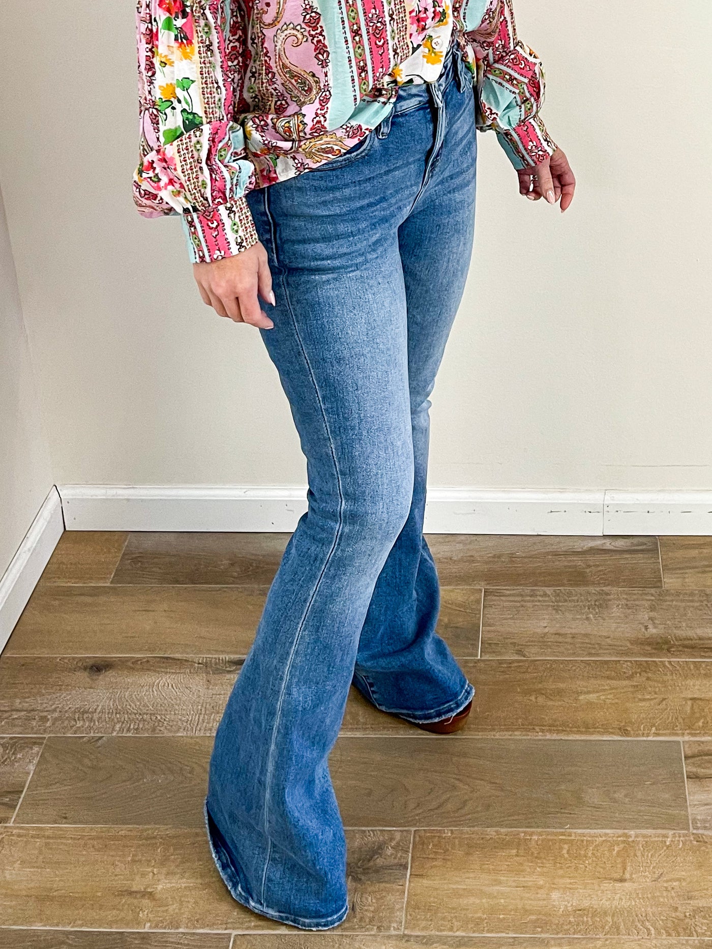 Get ready to relive the good 'ole days with the Remember That Time Flare! This high rise, light wash flare will have you looking and feeling like a blast from the past. (No time machine needed!) Get your groove on and show off those legs with this flirty and flattering style.