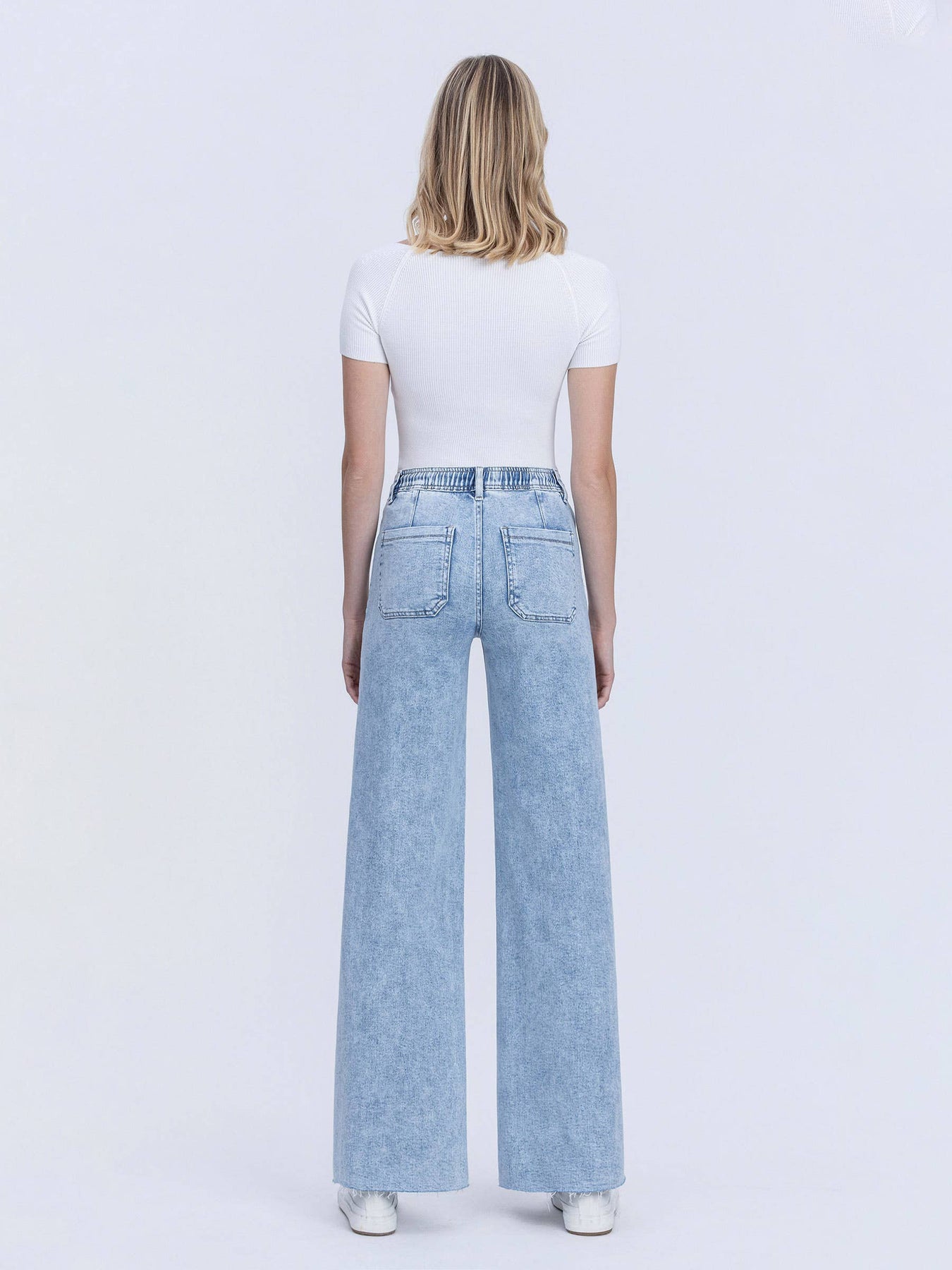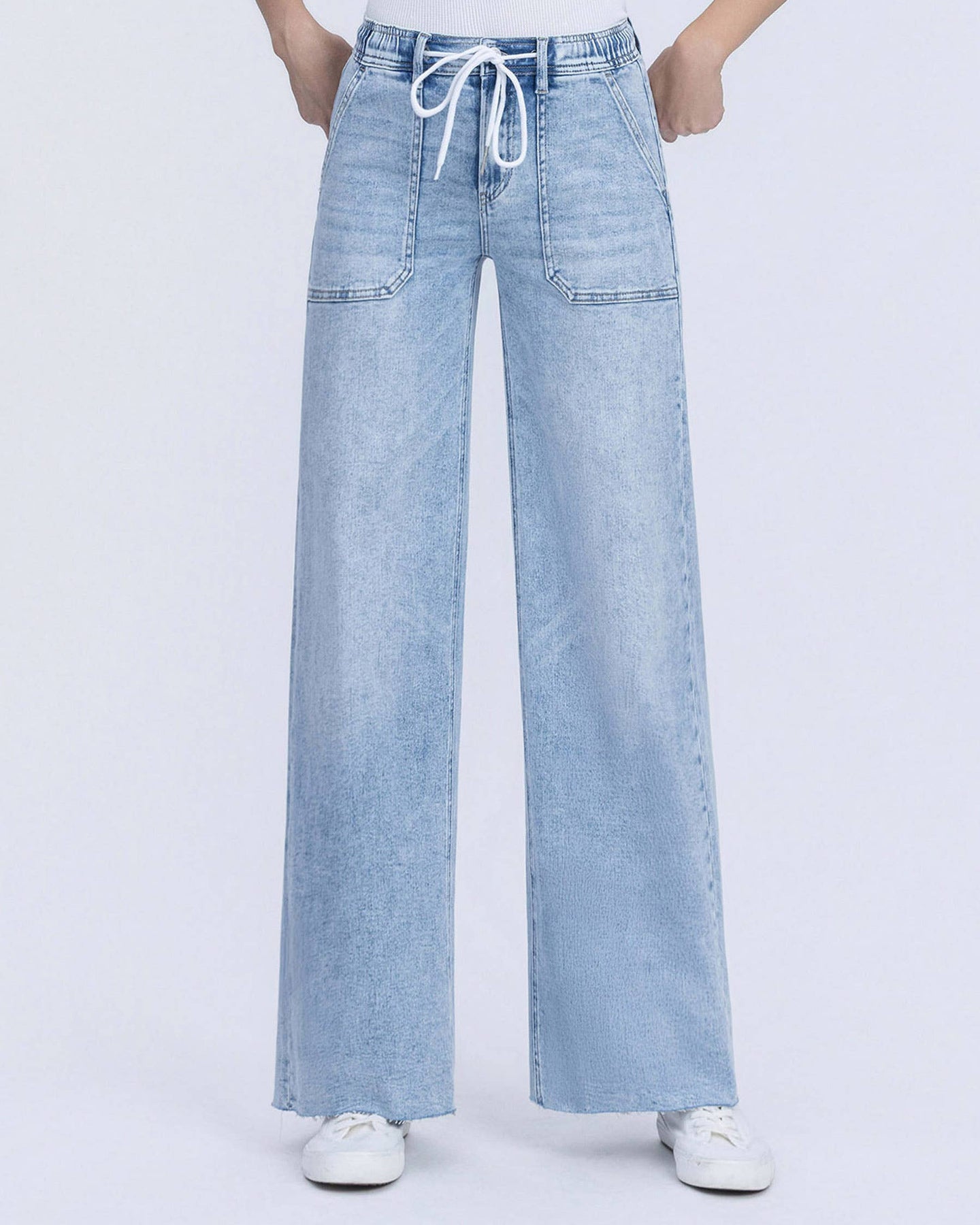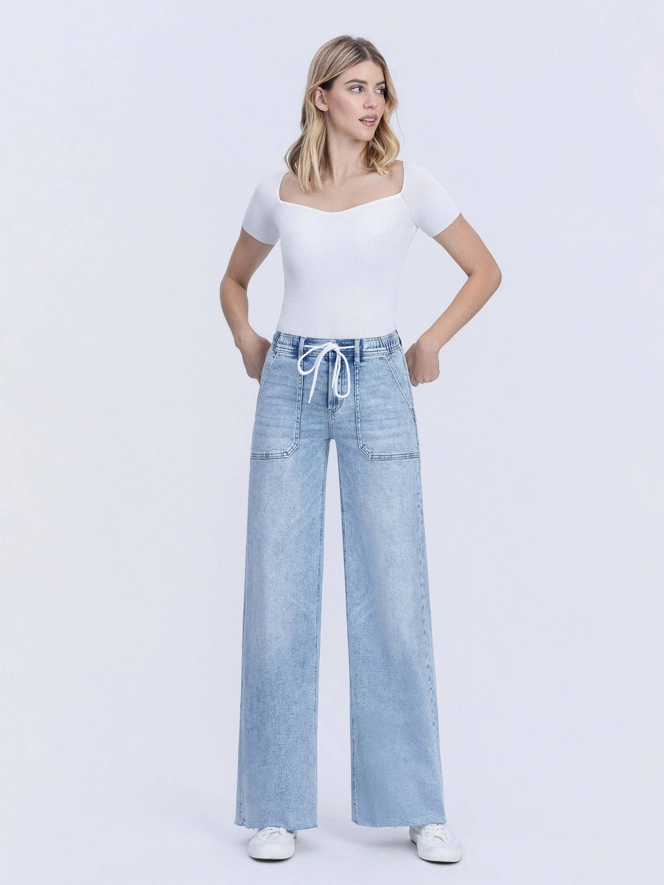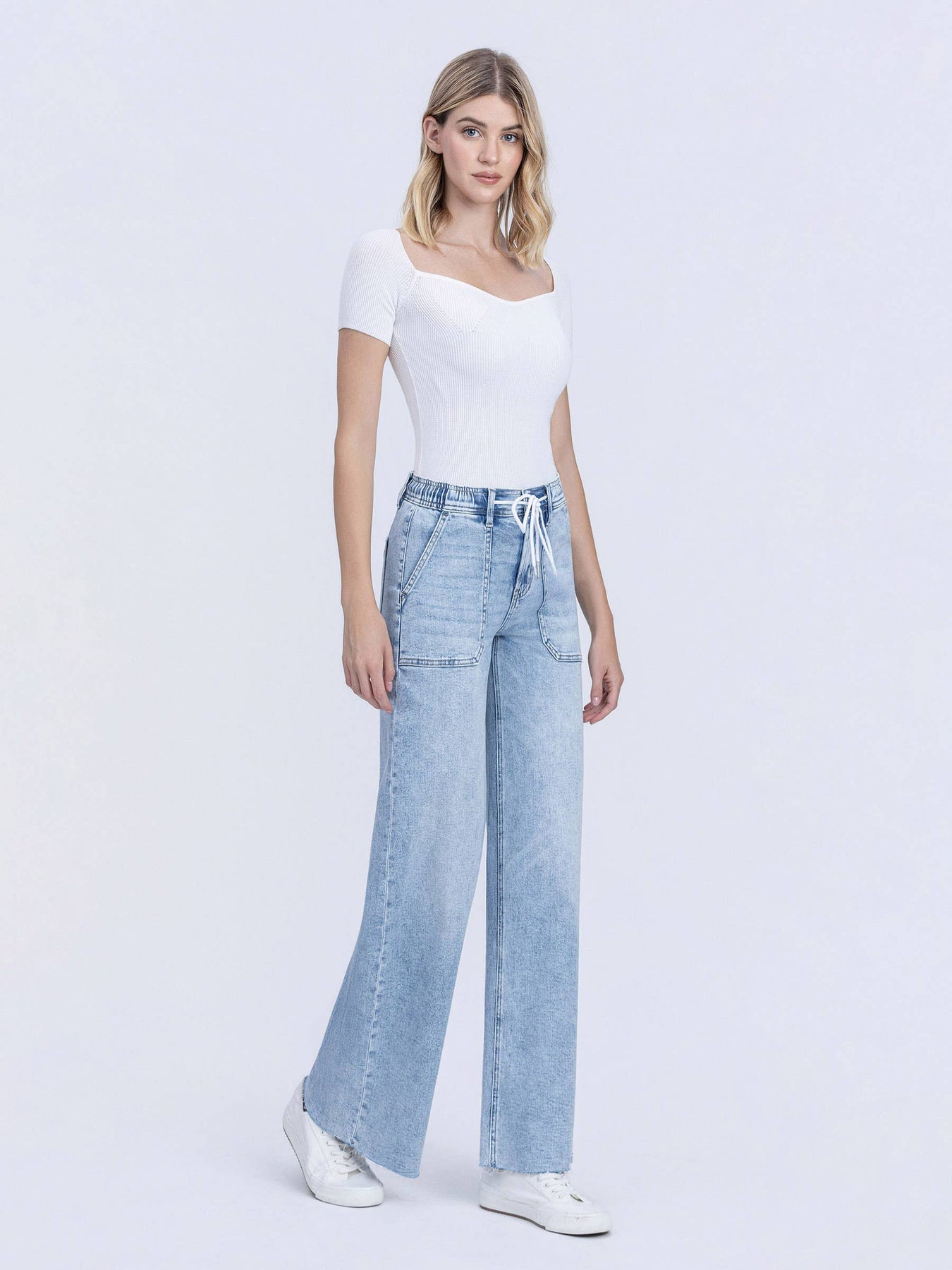 HIGH RISE DRAWSTRING WAISTBAND WIDE LEG JEANS COMFORT STRETCH DENIM, HIGH RISE WAIST, DRAWSTRING WAISTBAND, UTILITY POCKET DETAIL, RAW HEM, FULL LENGTH, LIGHT WASH, WIDE LEG JEANS F. RISE: 10" / INSEAM: 32" / LEG OPENING: 23"