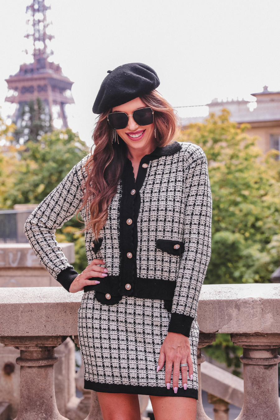 Take a Parisian-inspired journey with this Take Me To Paris Tweed Set! This fashionable tweed set includes a chic sweater and skirt with pearl buttons for an oh-so-elegant look. Strike that Parisienne pose to embrace your "Emily in Paris" vibe! Bon voyage! Fabric: 95% Polyester, 5% Spandex