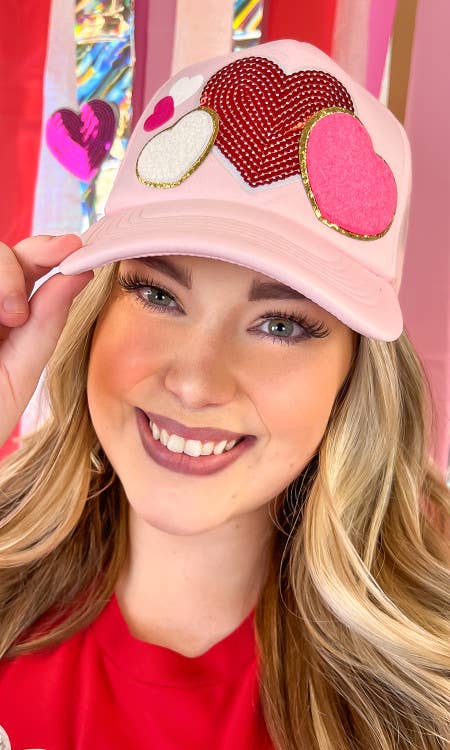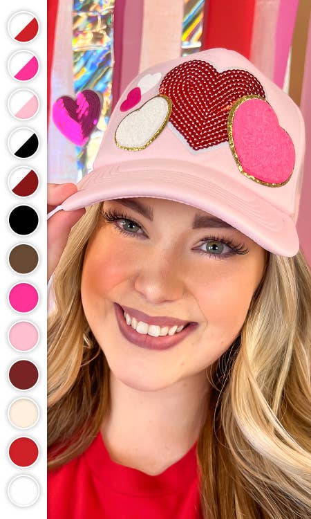 All The Love Valentine Patch Trucker Hat A mesh back trucker style hat with a plastic snap closure, in your choice of color. This trucker hat's design features several overlapping patches of hearts of various colors, in a variety of types, such as sequin, chenille, and velvety flock. This accessory is perfect for Valentine's season! Note: Sequin patch colors may vary from product photos. Sizing Hint: This is a standard fit hat. Adjust the snaps to suit you. Care Instructions: Hand wash with mild soap, lay flat to dry.