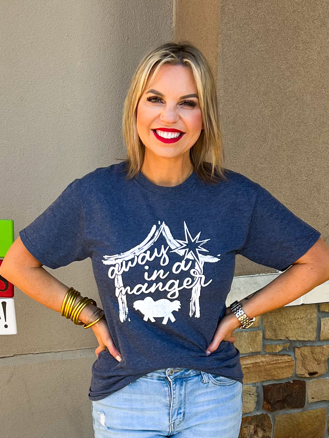 Away in a Manger Christmas Graphic T-Shirt 100% cotton vintage heather navy graphic t-shirt. This graphic t-shirt's design features the words, "away in a manger," in a simple Nativity scene. This top is perfect for Christmas season! Sizing Hint: This is a basic unisex tee, which fits true to size.