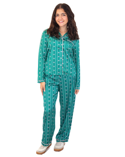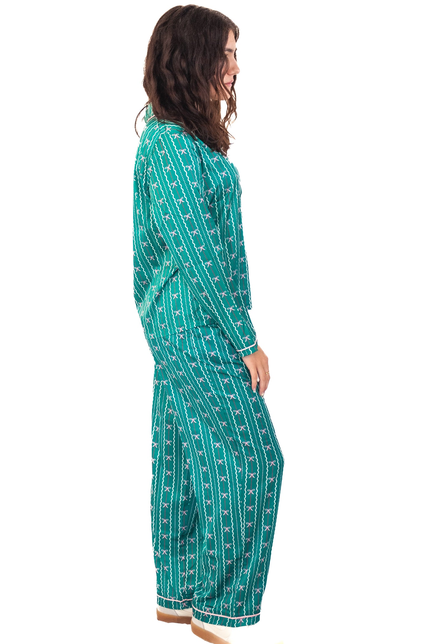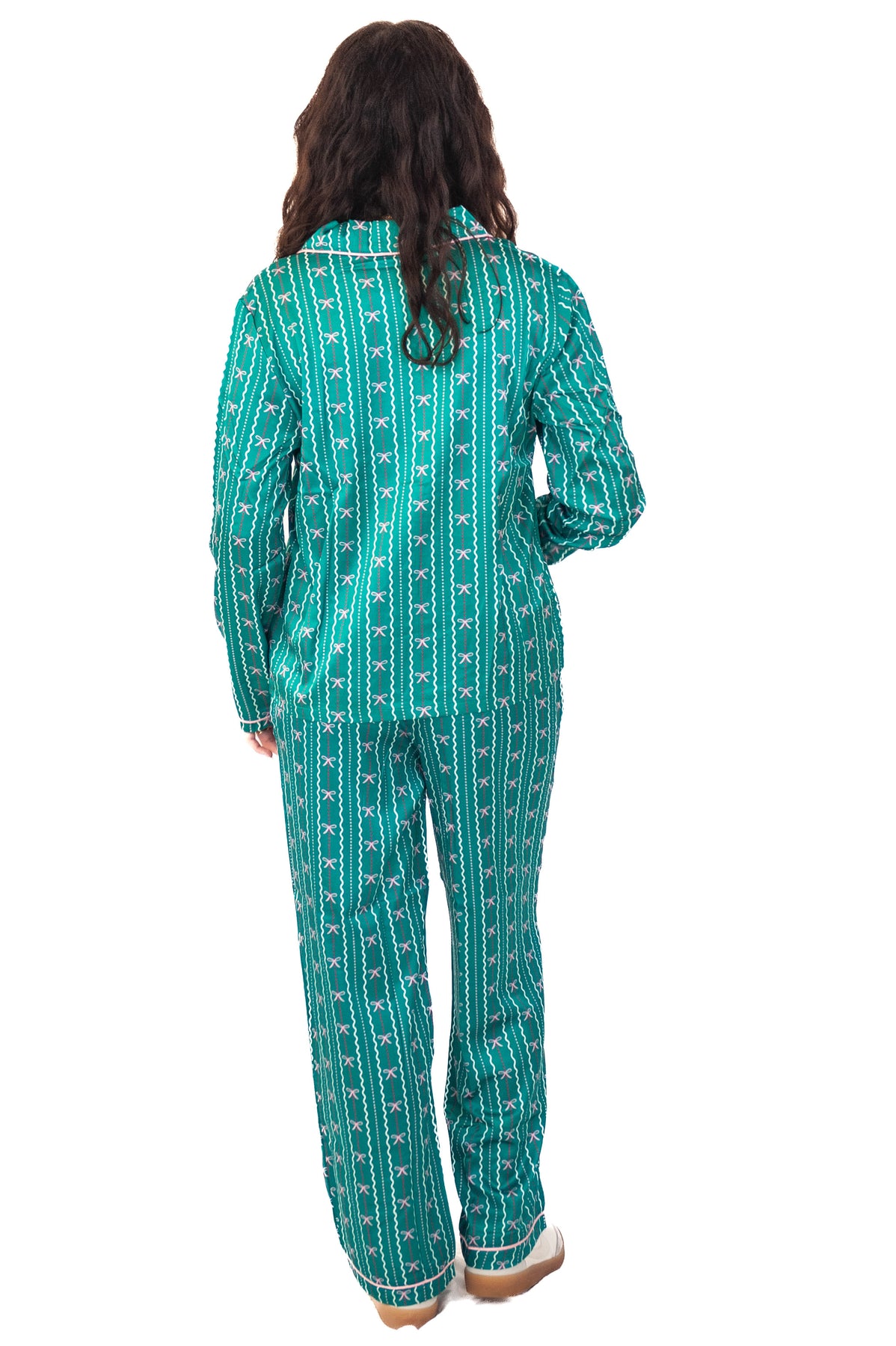 Slip into the Charlotte Bow Lounge Set, where silky green satin meets charming pink bows and playful dots. This delightful pajama set brings a touch of whimsy to your relaxation time, combining comfort with a fun, flirty style perfect for cozy nights in or lazy weekends.