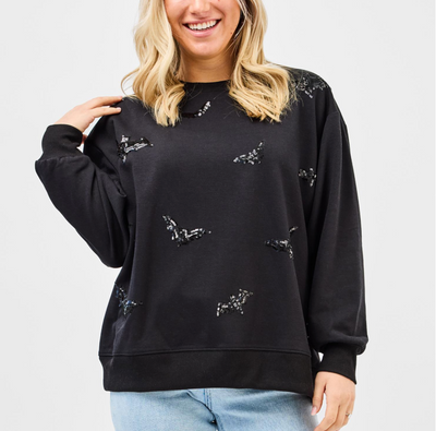 Get into the spooky spirit with this Halloween Black Bat Sweatshirt! Featuring shimmering black sequin bats that dance across a cozy black fabric, it’s perfect for adding a playful touch to your fall wardrobe. Stay warm and festive while showing off your love for all things eerie and fun.