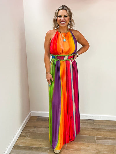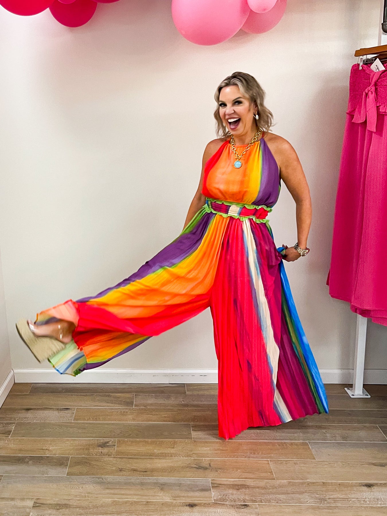 Be a colorful and playful trendsetter in our Juliet Rainbow Jumpsuit. With a halter neckline, smocked waistband, and pleated pants, this woven jumpsuit will have you feeling stylish and comfortable. Plus, the back neck tie closure adds a fun touch to this must-have piece. Made of 100% polyester for a lightweight and flowy fit. (Can't wait to see you rock this at your next event! 🌈)