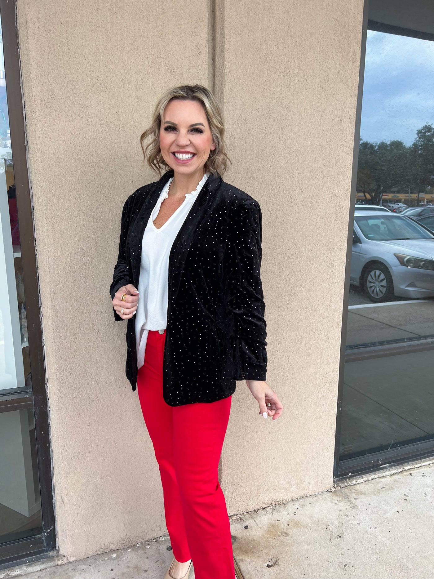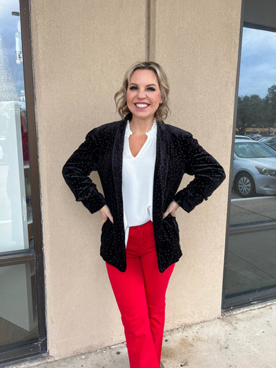 Unleash your daring spirit with the Phoebe Rhinestone Blazer. This velvet blazer features a shawl collared neckline and eye-catching rhinestone detail. Perfect for making a bold statement, this blazer will take any outfit to the next level. Take a risk and add this unique piece to your wardrobe!