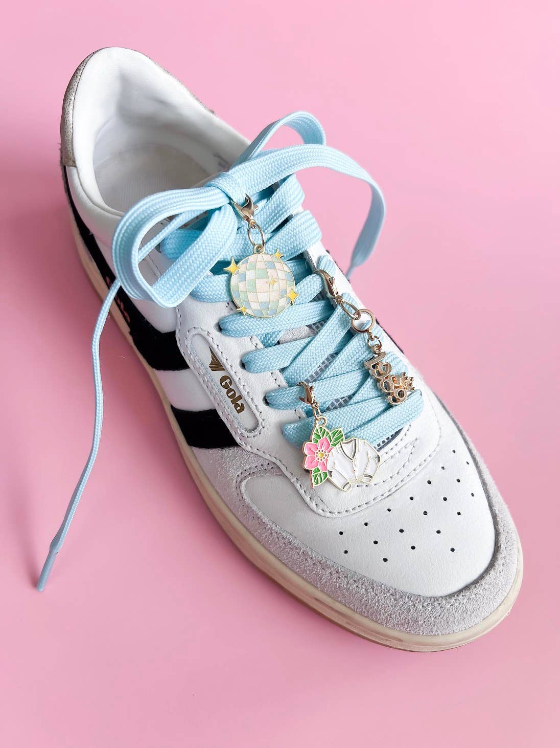 Calling all Swifties! Add a dash of Taylor-inspired flair to your favorite sneakers with fun shoelace charm sets. These charming accessories are perfect for expressing your love for Taylor Swift through your style! Each set comes with a vibrant pair of shoelaces in Swift-inspired colors – like "Lover" teal. They easily attach to any standard lace, adding a pop of personality that’ll make you feel closer to the songs, the albums, and the moments you adore.